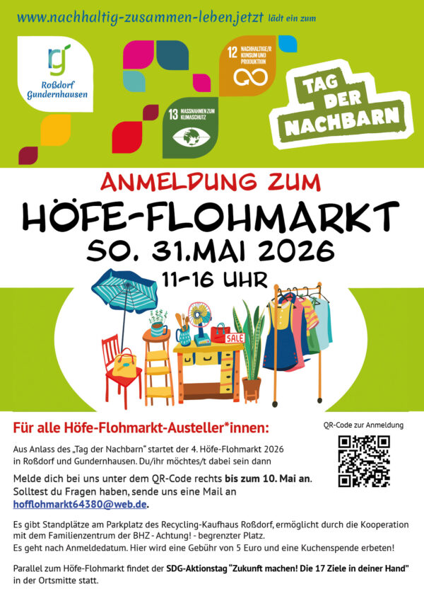 Aus Anlass des „Tag der Nachbarn“ startet der 4. Höfe-Flohmarkt 2026 in Roßdorf und Gundernhausen. Du/ihr möchtes/t dabei sein dann
