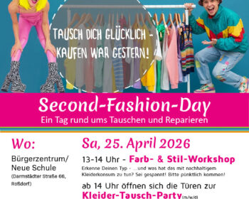 Second-Fashion-Day Ein Tag rund ums Tauschen und Reparieren Wann: Sa, 25. April 2026 Wo: Bürgerzentrum/Neue Schule Darmstädter Str. 66, Roßdorf Programm: 13-14 Uhr – Farb- & Stil-Workshop Erkenne Deinen Typ – …und was hat das mit nachhaltigem Kleiderkonsum zu tun? Sei gespannt! Bitte pünktlich kommen! Mit Thea Hafner ab 14…